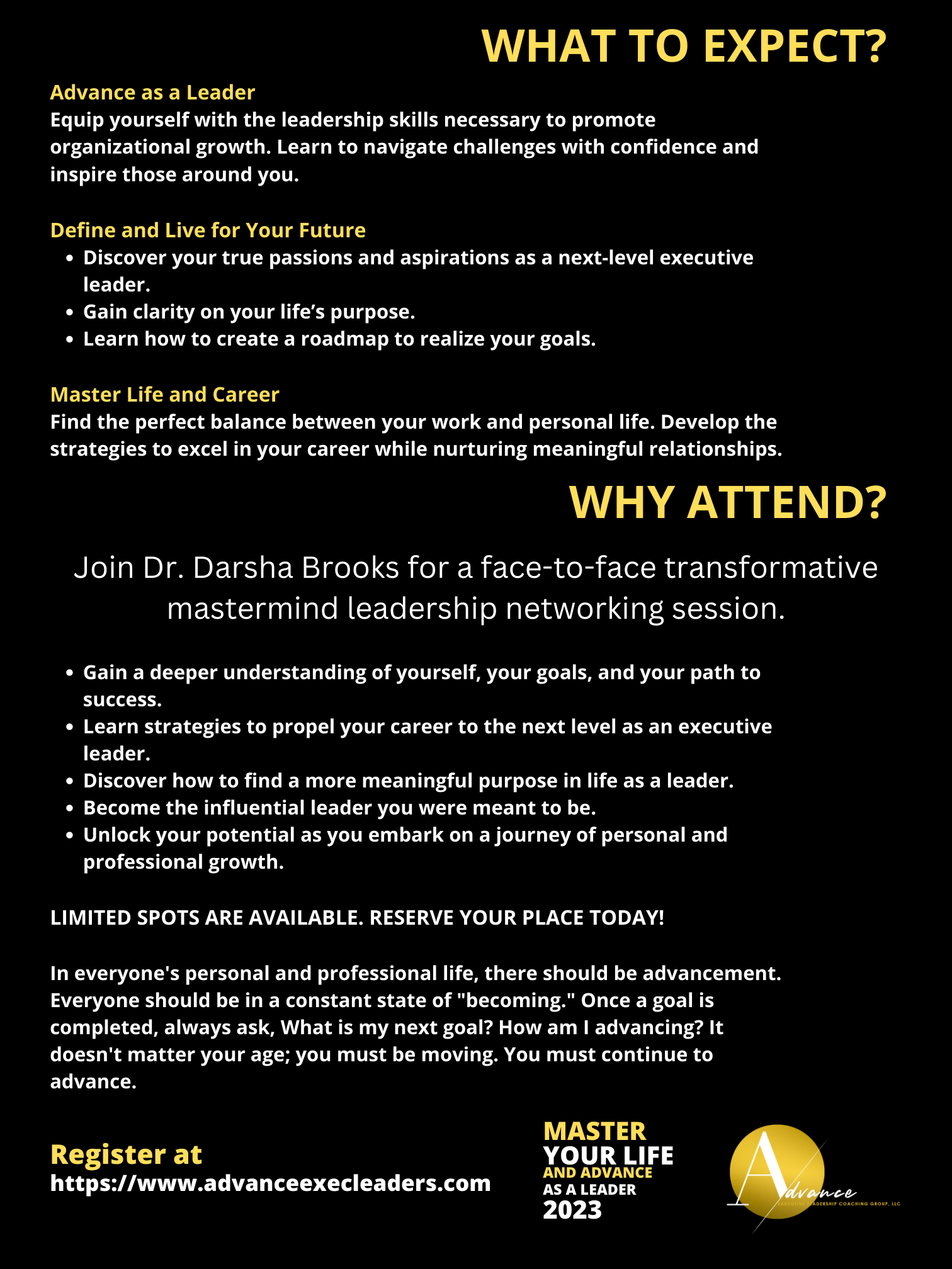 Contact us at DrBrooks@AdvanceExecLeaders.com to schedule an individual, team, or corporate leadership development session.